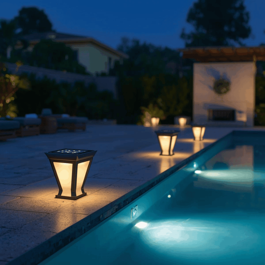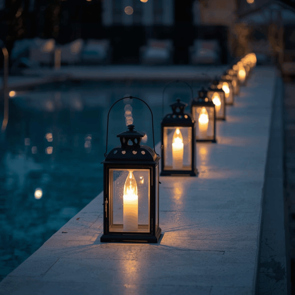 Recessed lights installed in decking or steps add both style and function, helping prevent accidents by clearly defining pool access points. - Lanterns and Decorative Fixtures: